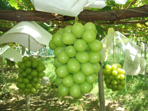 昼は暑く、夜は涼しい甲府盆地は、ブドウの適地ですが、甲府市の東部地域は、その中でも早場産地として古くからブドウ栽培が盛んに行われてきました。また、桑園からの転換作物として中道地区でも栽培が行われてきました。