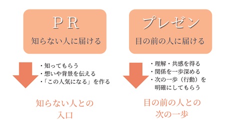 講義の中では、PRとプレゼンの違い(不特定多数への発信と、目の前の相手に届ける伝え方)も整理され、