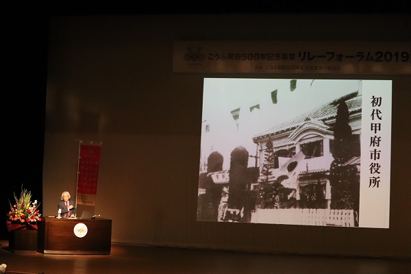 昨年の「近世/江戸時代」からのバトンを引き継いだ今回のテーマは、「近代/明治・大正」です。山梨大学名誉教授の齋藤康彦先生による基調講演のほか、パネルディスカッションではさまざまな分野の専門家の方々に私も加えていただき、「近代都市甲府の誕生と発展」について討論しました。