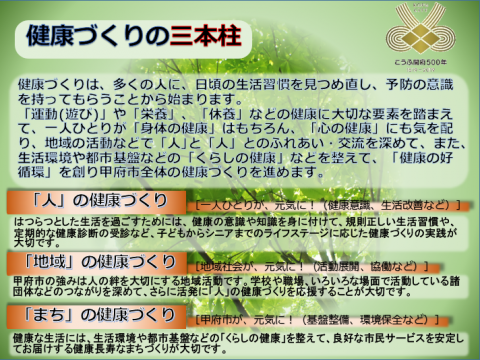 「運動(遊び)」や「栄養」、「休養」などの健康に大切な要素を踏まえて、一人ひとりが「身体の健康」はもちろん、「心の健康」にも気を配り、地域の活動などで「人」と「人」とのふれあい・交流を深めて、また、生活環境や都市基盤などの「くらしの健康」などを整えて、「健康の好循環」を創り、甲府市全体の健康づくりを進めます。
