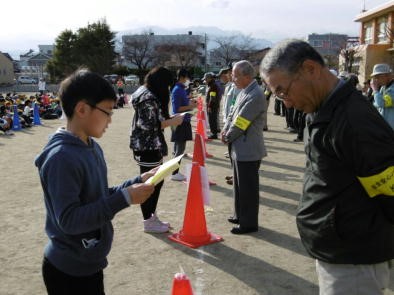 小学校の児童と顔あわせとして4月に「出発式」を、年度末に「お礼」の会を行い、町別班制によりボランティアの皆さんと集団下校を実施している。小学校では、授業参観や学校開放、学校便りを自治会の組回覧により情報状況をボランティア会員に周知して、見守りに役立たせている。・単位自治会では、通学路の点検や横断歩道やカーブミラーの清掃、グレーンベルトの確保、通学路近くの蜂の巣の駆除なども実施してきた。この他、積雪時には、除雪を住民に呼びかけ地域住民の安全確保に努めた。また、不審者情報時には、その地域を重点的に見守り活動を実施、犯罪の抑止に努めている。