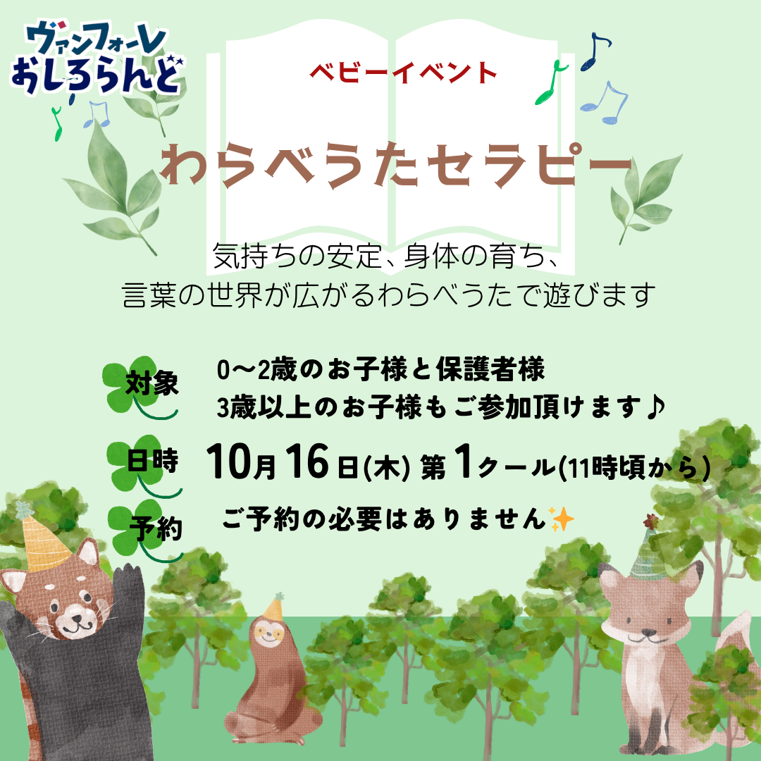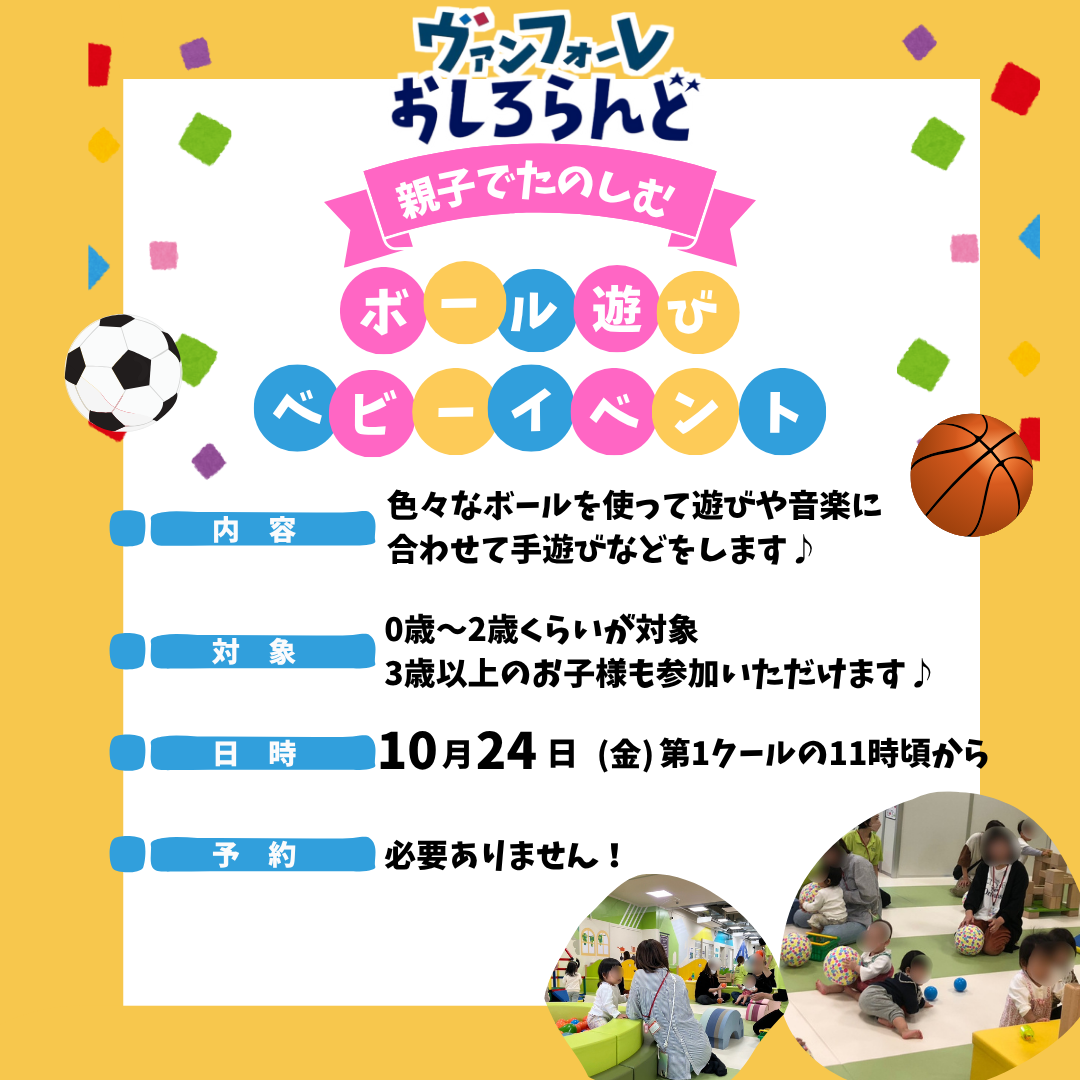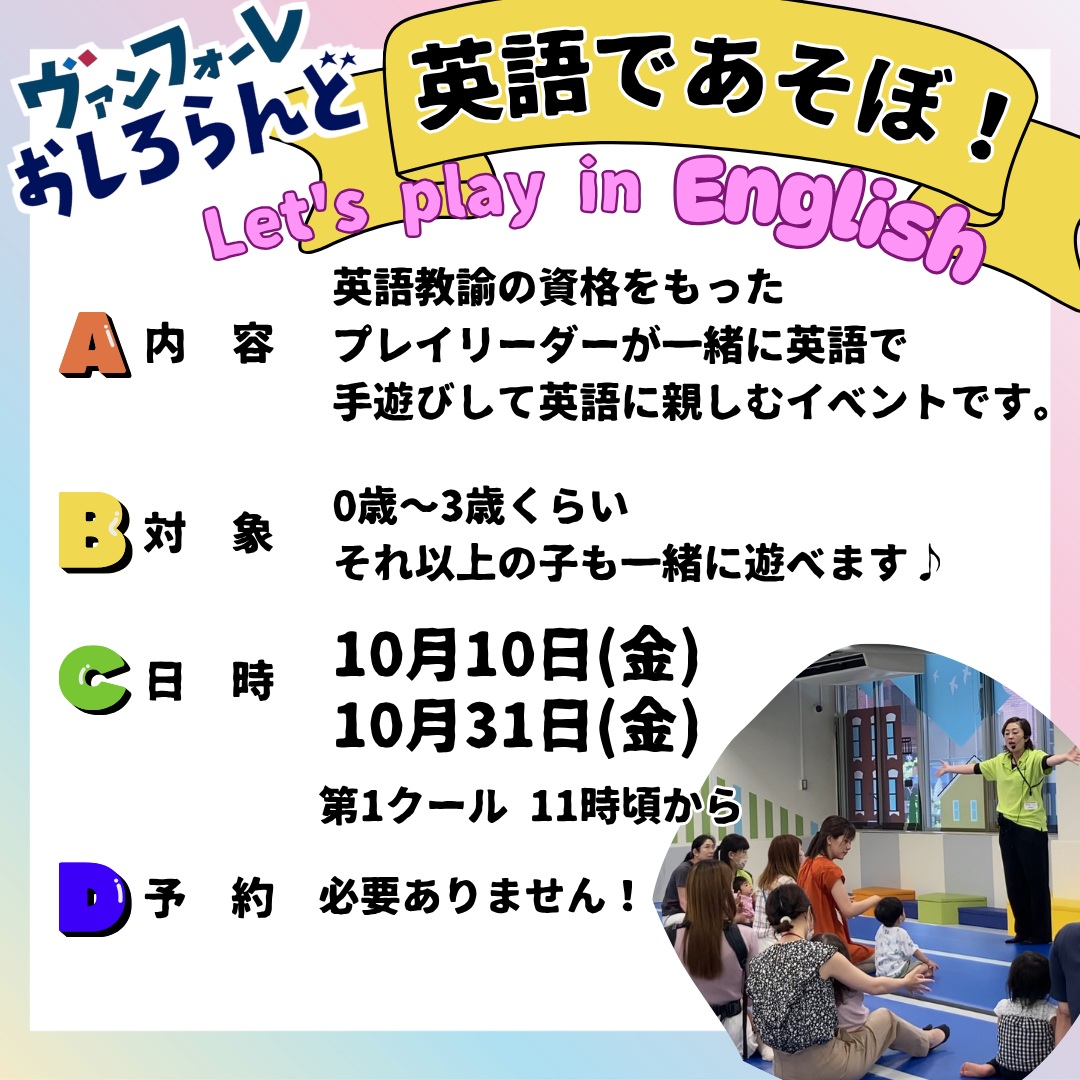 | 10月10・31日(金曜日) | 第1クール | 英語イベント(PNG:565KB) | 英語教諭の資格を持ったプレイリーダーが一緒に英語で手遊びして英語に親しむイベントです。 |