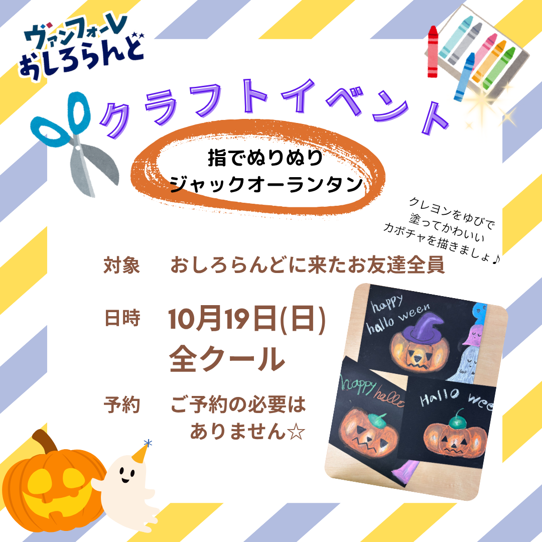 | 10月19日(日曜日) | 全クール | クラフトイベント(PNG:477KB) | ジャックオーランタンを指で描こう! |