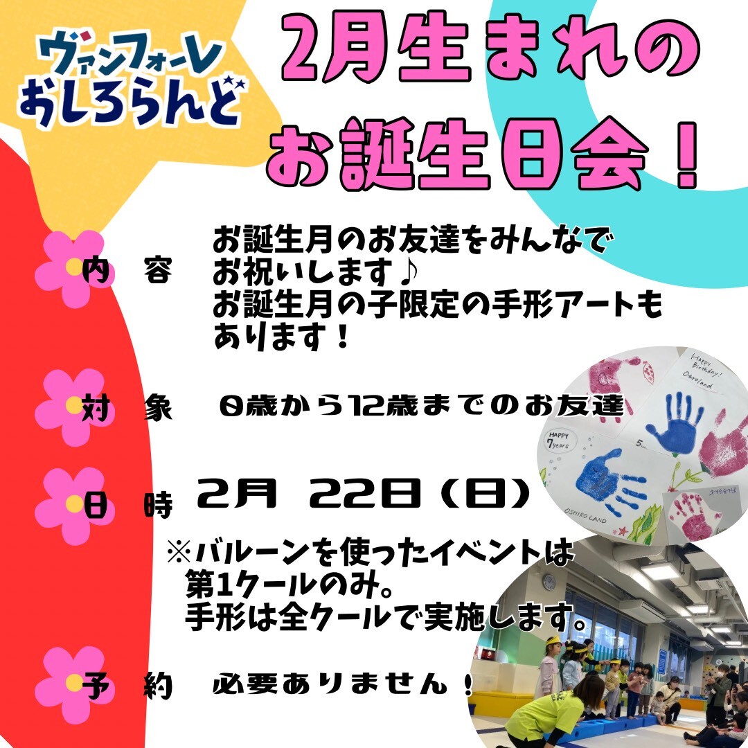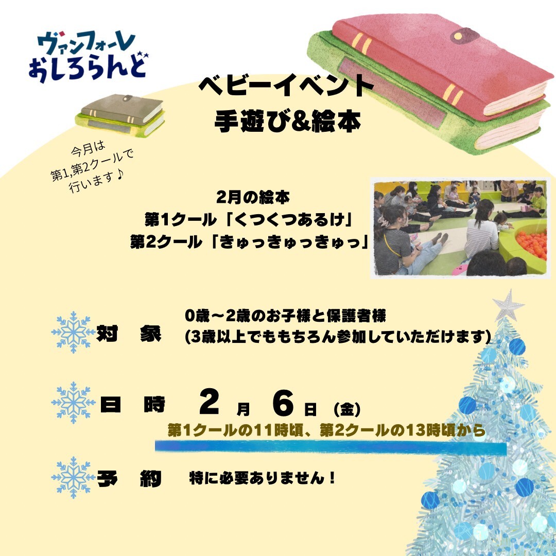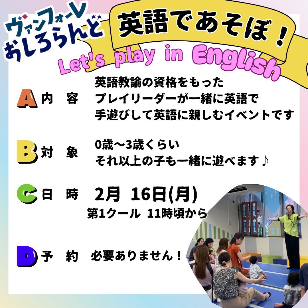 | 2月16日(月曜日) | 第1クール | 英語イベント(JPG:243KB) | 英語教諭の資格を持ったプレイリーダーが一緒に英語で手遊びして英語に親しむイベントです。 |