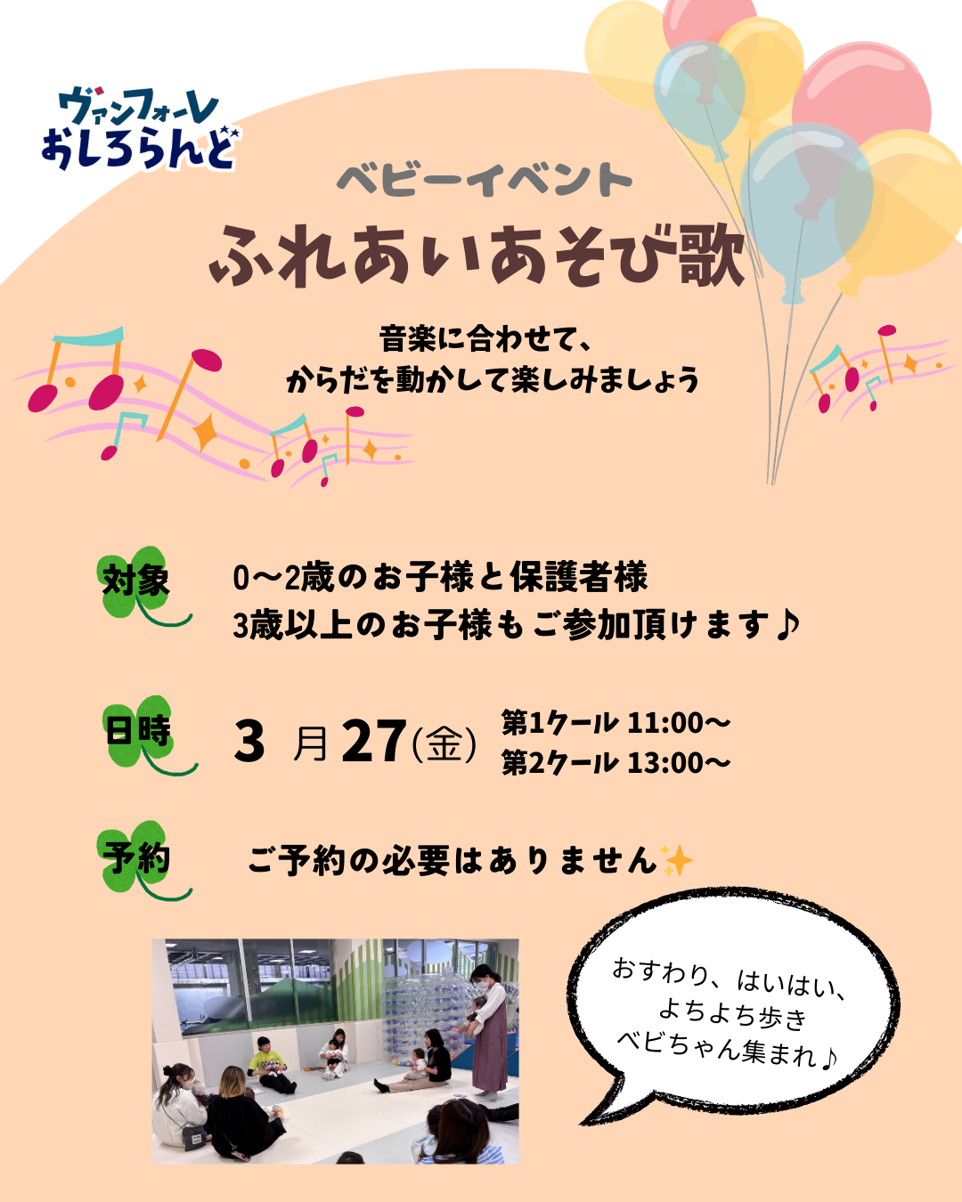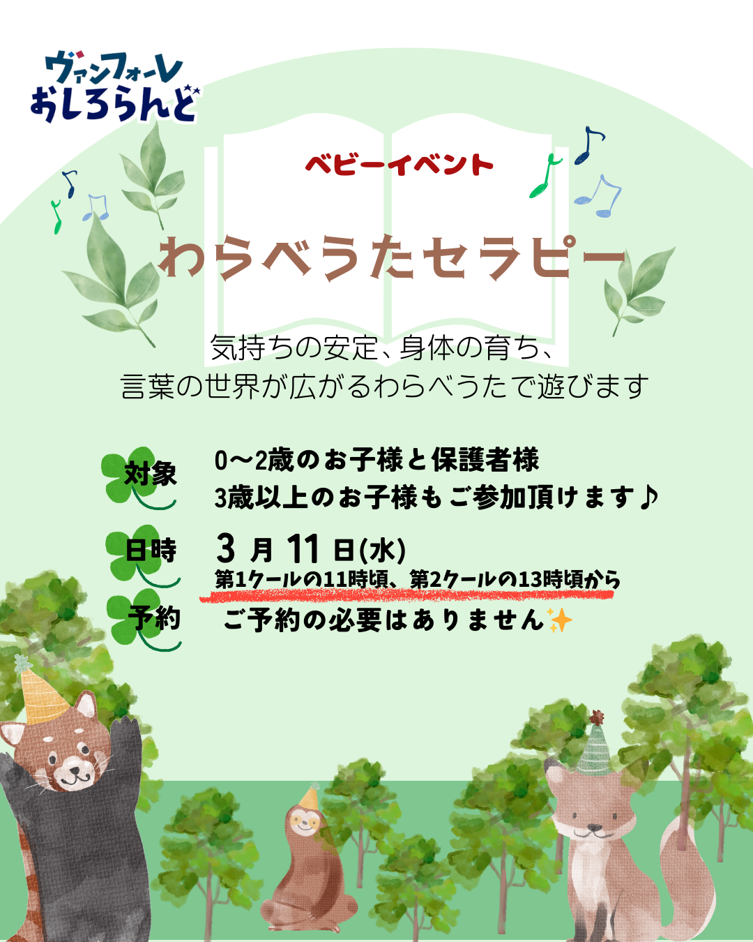 | 3月9日(月曜日) | 第1クール | 英語イベント(PNG:545KB) | 英語教諭の資格を持ったプレイリーダーが一緒に英語で手遊びして英語に親しむイベントです。 |
