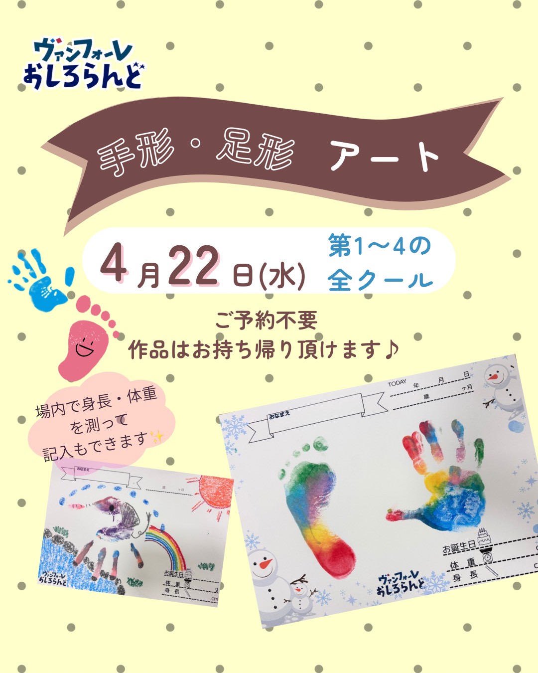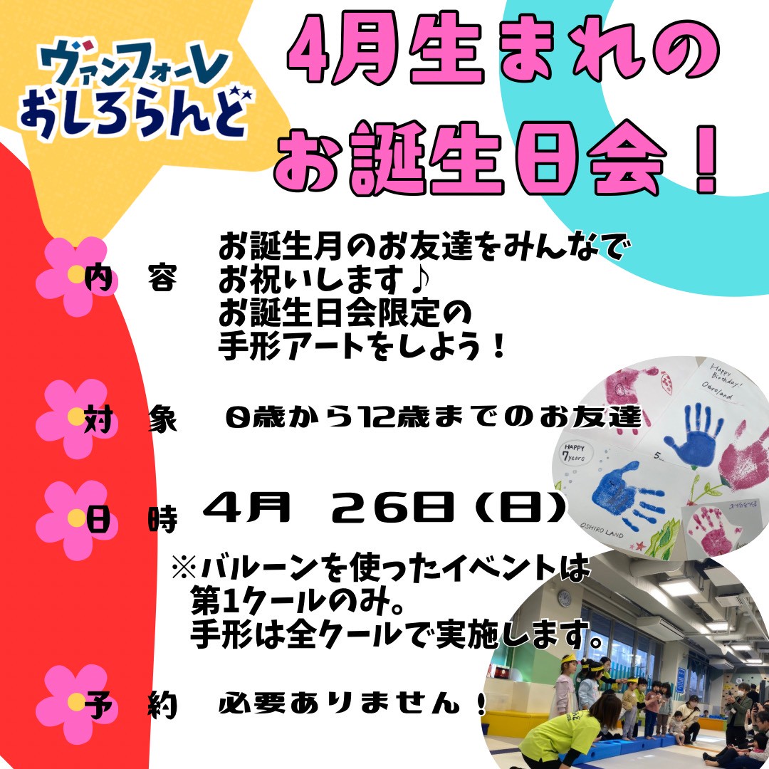 | 4月26日(日曜日) | 全クール | 4月生まれのお誕生日会(JPG:250KB) | 手形アート(全クール)とバルーン(第1クールのみ)を使ってお誕生日ケーキを作ります。 |
