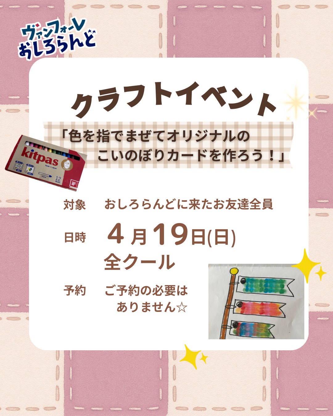 | 4月19日(月曜日) | 全クール | クラフトイベント(JPG:292KB) | クレヨンでこいのぼりを作ろう! |