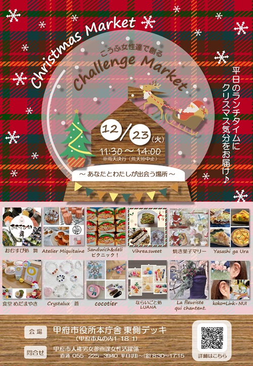 ホーム > 仕事 > 女性の起業等支援『Can-Passスタイル』〜女性の活躍と交流機会の創出〜 > こうふ女性達で創るチャレンジマーケット事業紹介 > 12月23日開催★「こうふ女性達で創るチャレンジマーケット」