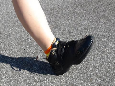 (2)シューズを履いたら、かかとで軽く地面をたたくようにして、かかとをしっかりとシューズのヒールカウンター部分におさめます。
