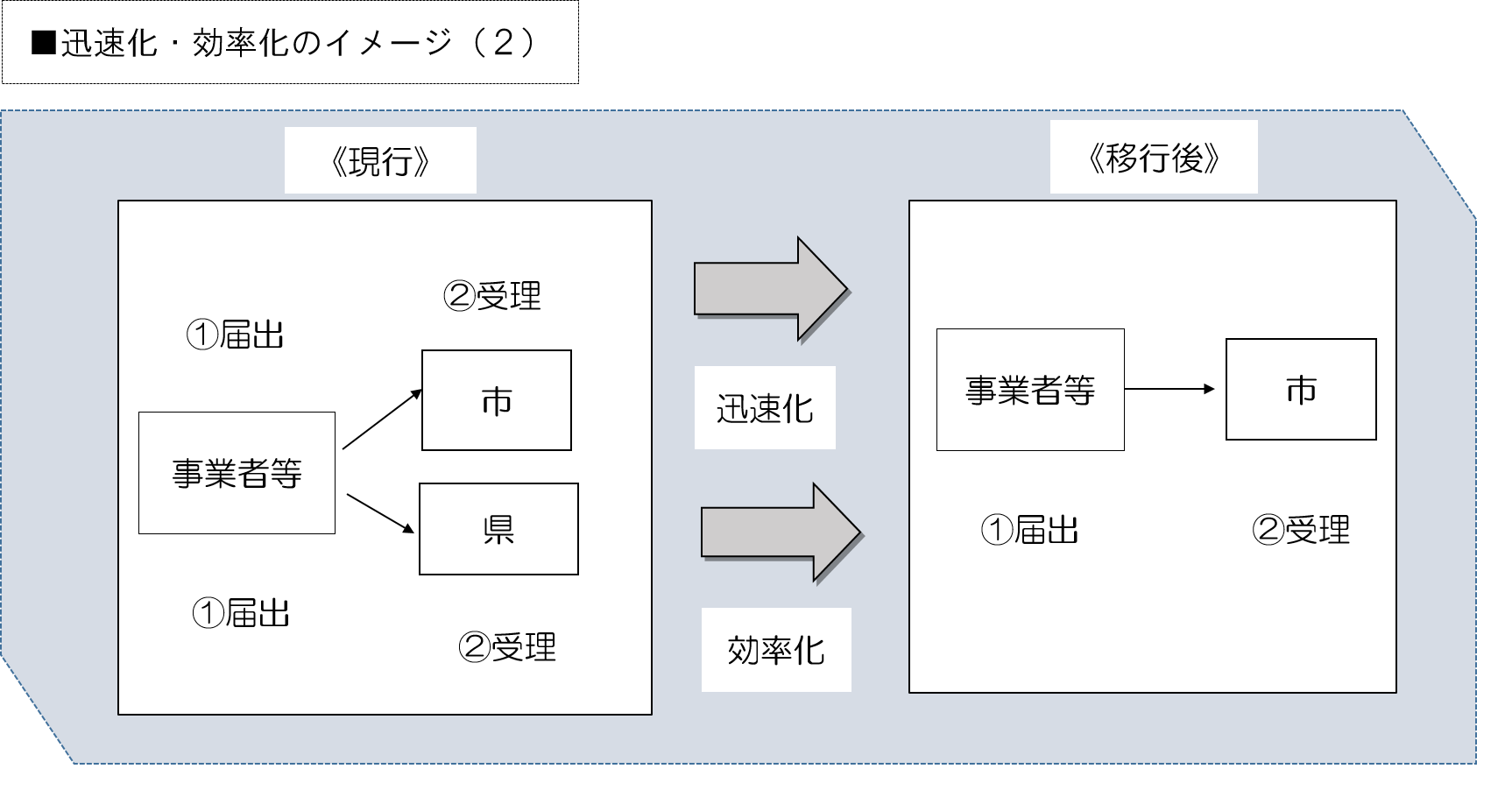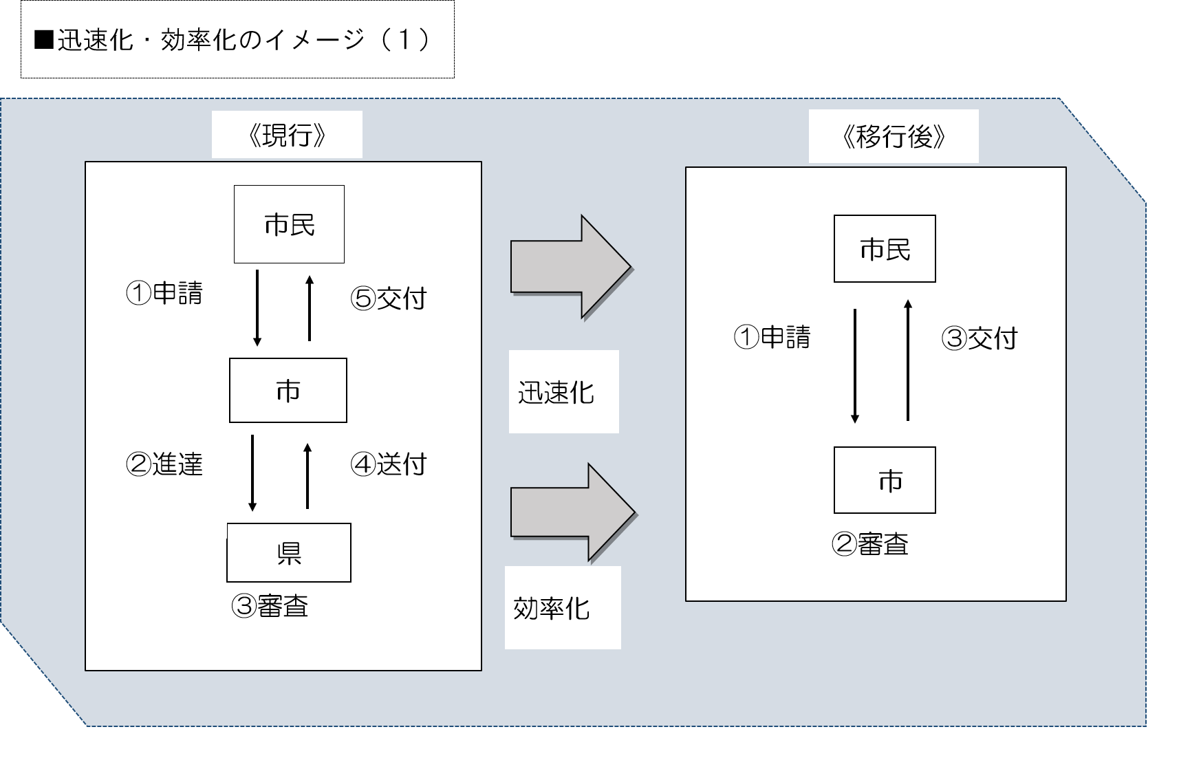 これまで市を経由して県が行ってきた事務を、市が一括して行うことにより、事務処理時間が短縮され、迅速で効率的な行政サービスの提供による、市民の利便性の向上が図られます。