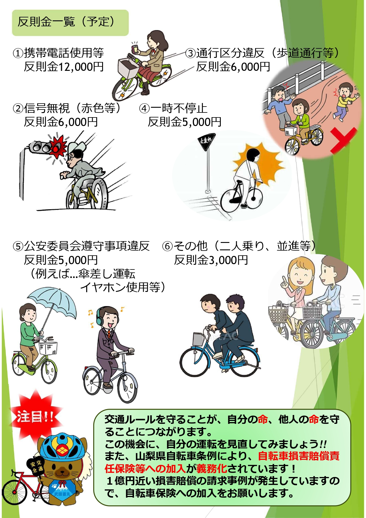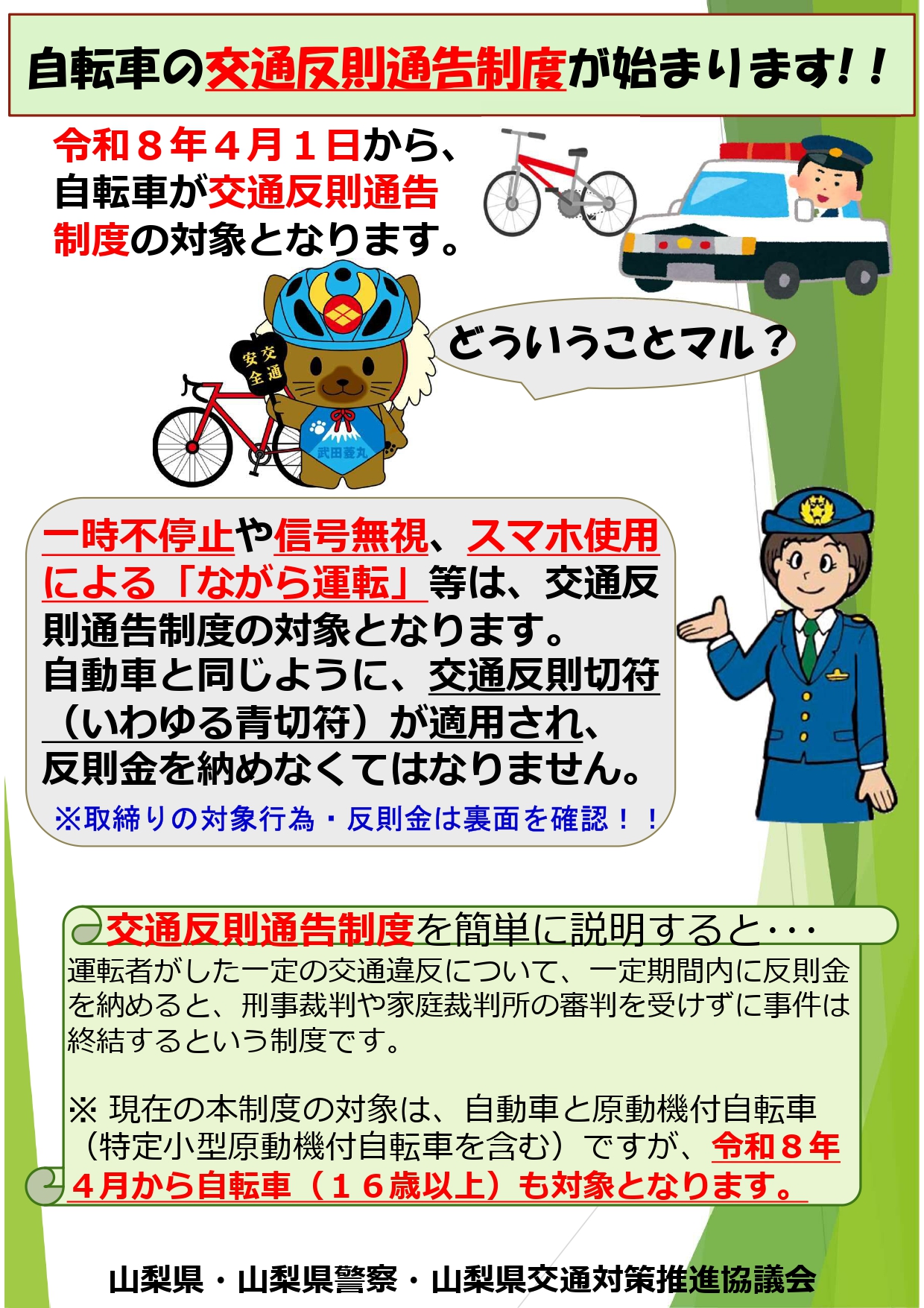 詳細は下記リンクより、警察庁自転車交通安全ポータルサイトまたは、山梨県警ホームページをご覧ください。