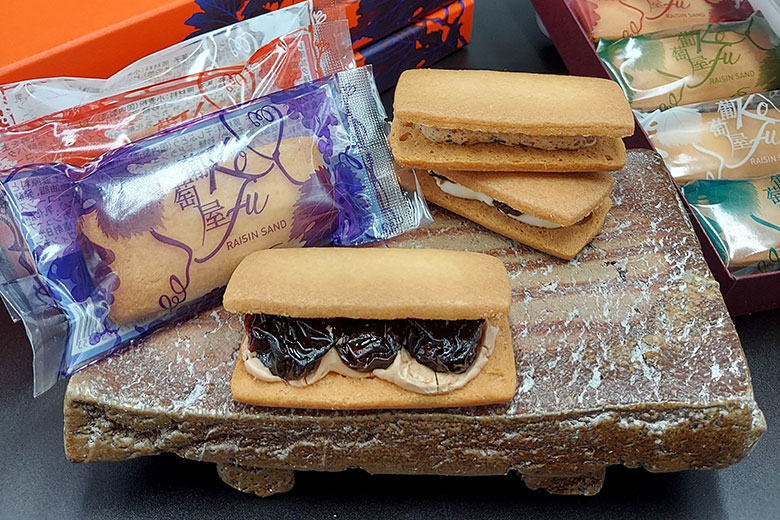 手作りの「レーズンサンド」も。甲府市内で収穫した黒ブドウと、甲府のワイナリーの赤ワインを使ったクリームをサンドした「こうふのまちのレーズンサンド」など全6味。こんなレーズンサンドは初めてどれも美味!1個¥238~(税込)