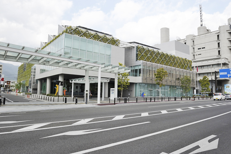 山梨県立図書館は、JR甲府駅北口からすぐのロケーション。カフェは北口側の入口脇にある。