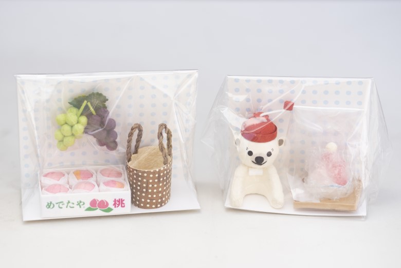 季節の風物詩の紙細工は可愛らしくて見ていて飽きません。ぶどうと桃、かき氷。